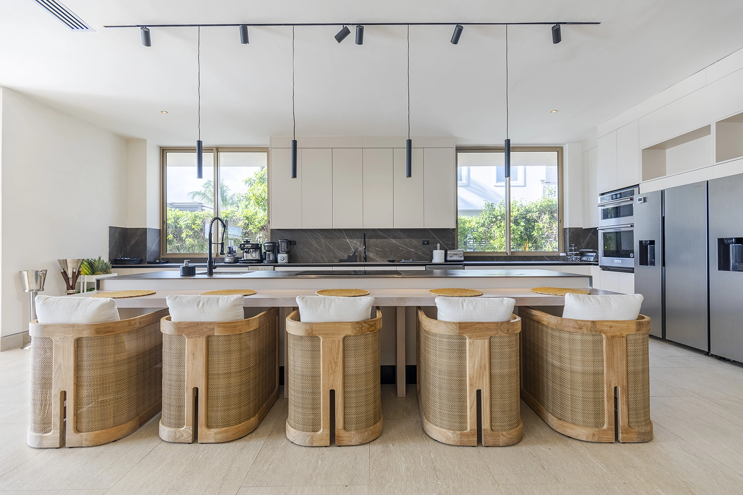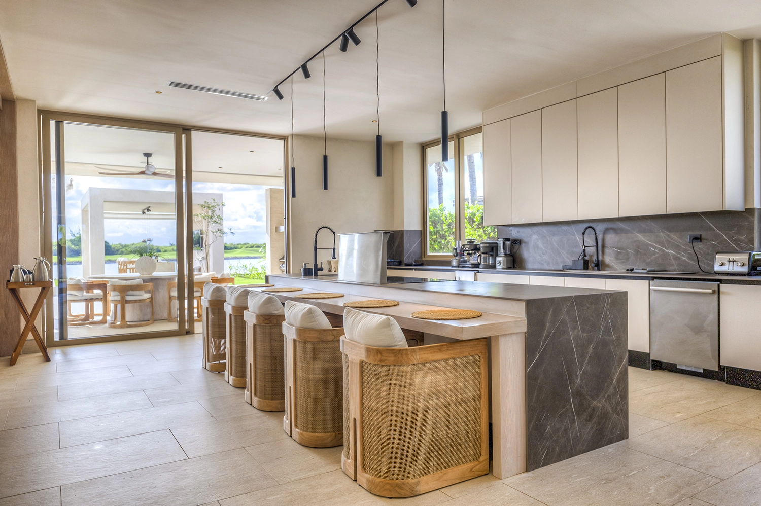 Le design intérieur de la splendide Villa Solara se distingue par ses tons neutres qui créent une continuité entre intérieur et extérieur. Cette harmonie est mise en valeur par les revêtements de la collection Davos, que rehausse la reproduction d’inclusions brillantes de quartz blanc, propres à la pierre des Alpes suisses.